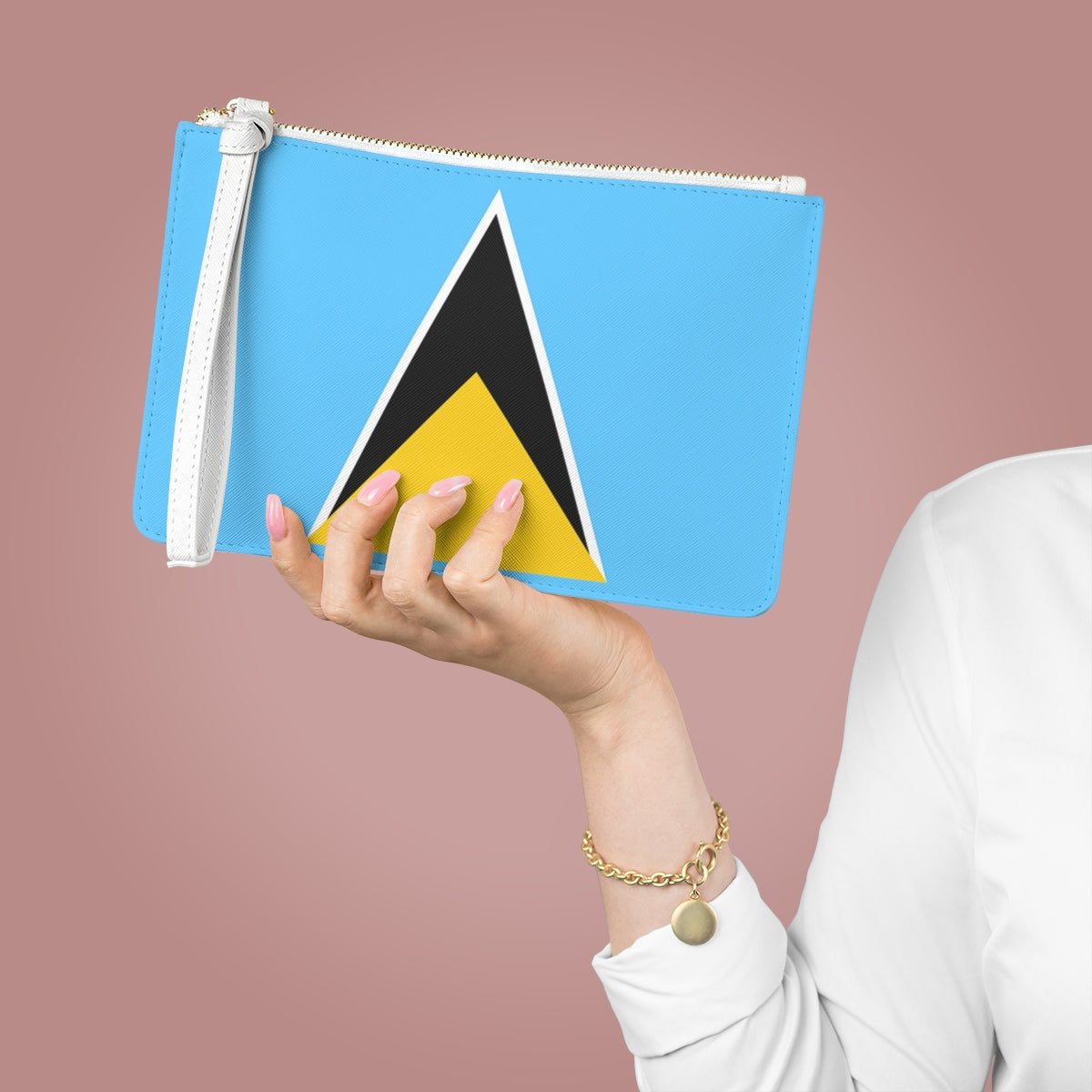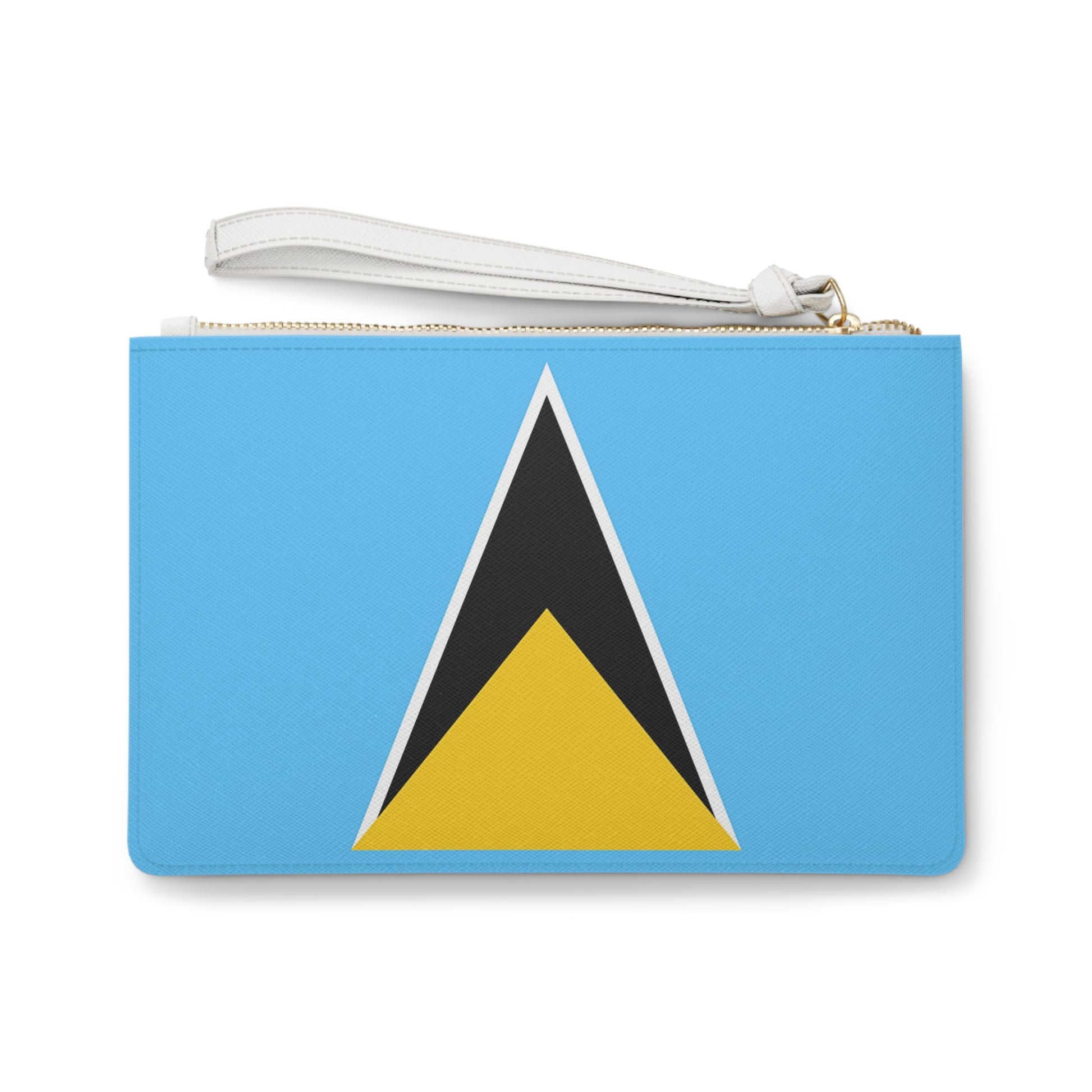 "Ou bel!" (You're beautiful!) Accessorize with St. Lucian elegance! This stylish loop clutch features the beautiful blue, gold, black, and white of the St. Lucia flag with its triangular design ā colors that symbolize the Caribbean waters, sunshine, African heritage, and the unity of the St. Lucian people.