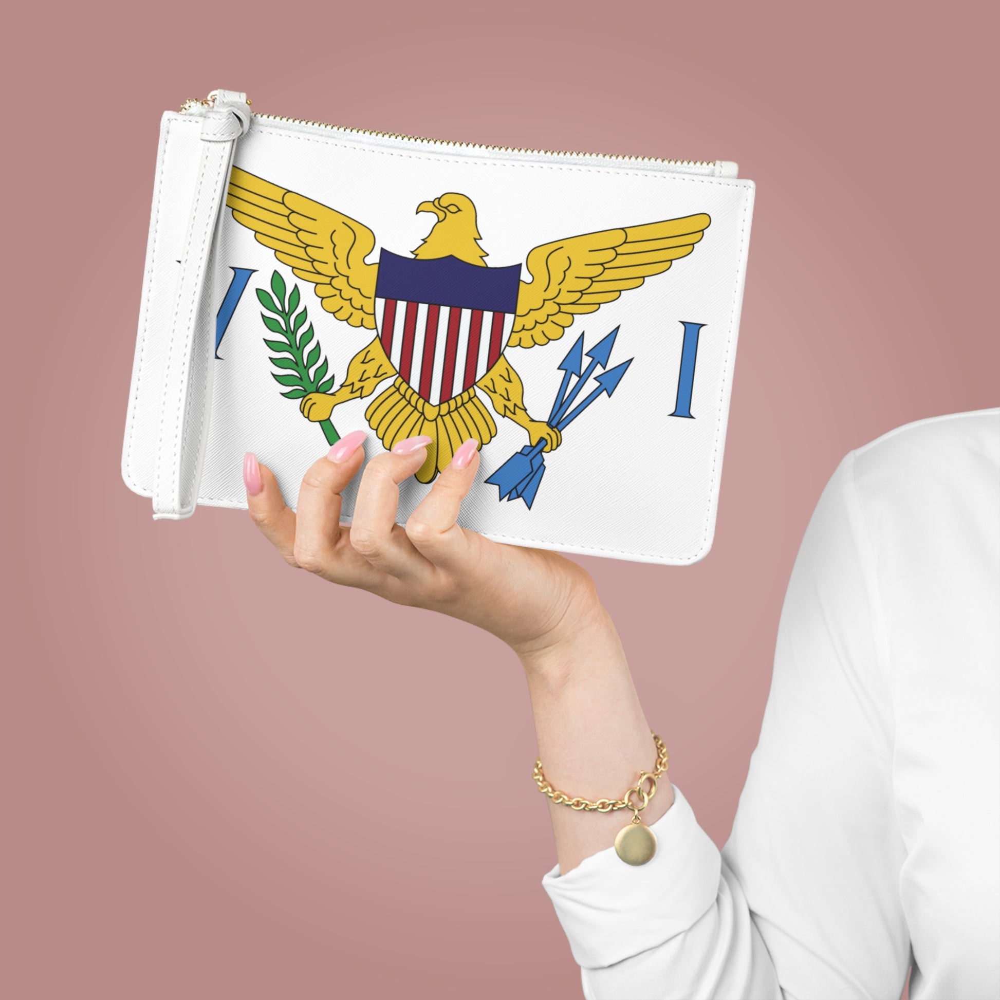 "Looking sharp, VI style!" Accessorize with Virgin Islands elegance! This stylish loop clutch features the beautiful white, blue, red, and yellow of the U.S. Virgin Islands flag with its eagle and shield ā colors that symbolize purity, the Caribbean waters, courage, and the rich heritage of the islands.