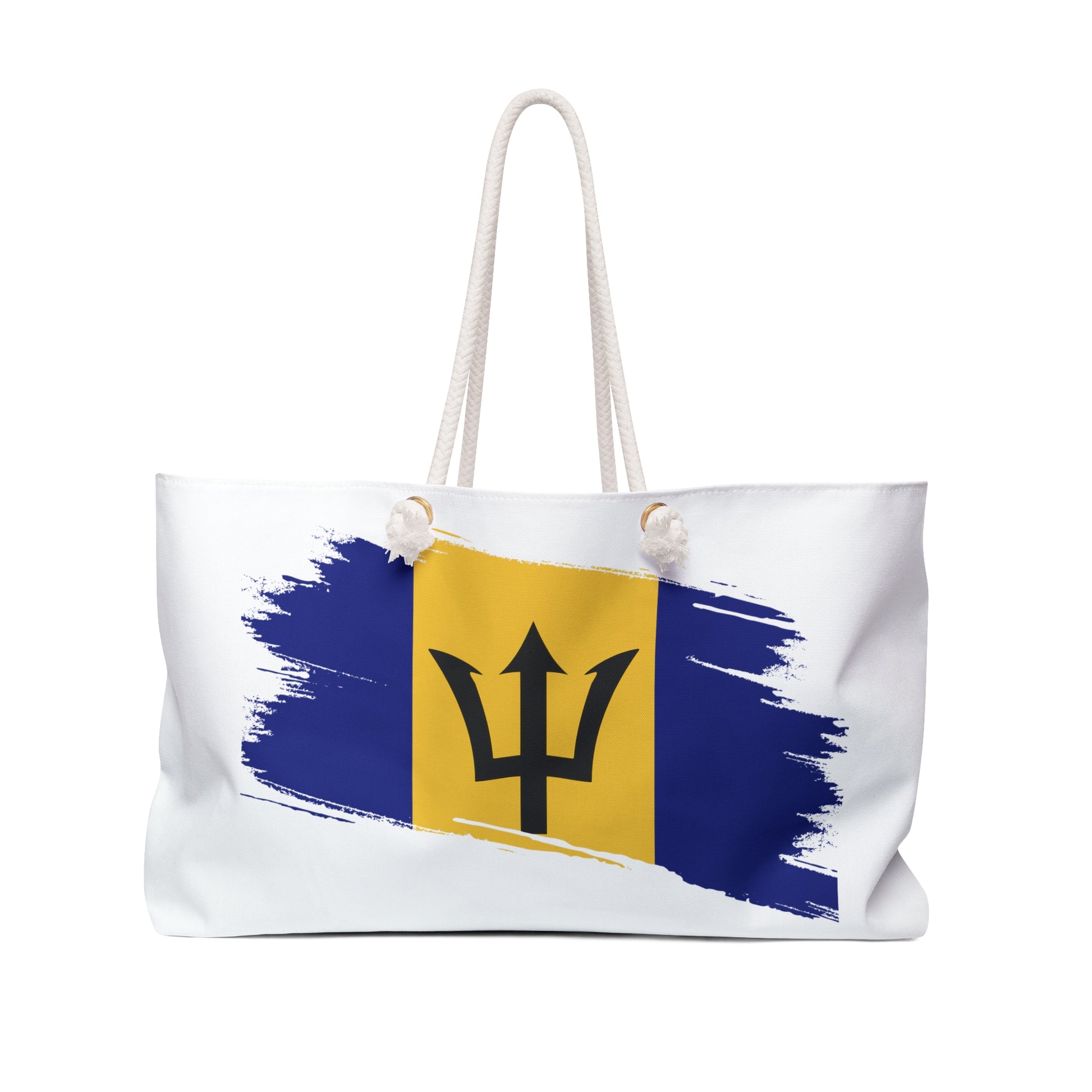 "Time to travel!" Travel with Bajan pride! This spacious weekender bag features the vibrant ultramarine, gold, and black of the Barbados flag ā colors that represent the Atlantic waters, golden sunshine, and the strength of the island.